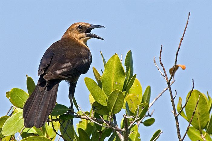 | Boat-tailed Grackles are large blackbirds, males are black but females like this are dark brown with light brown heads. |