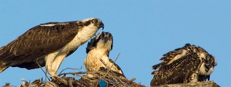 | Osprey nest at sunset. Mom (or Dad) is dividing up a nice size fish. The chick on the right is not growing barnacles -- they are attached to a branch that was used to build the nest. |