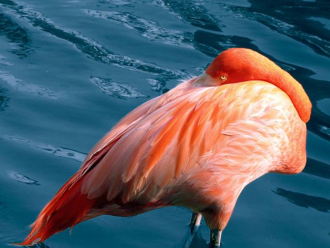 | As a sleeping position, this just does not look comfortable. This flamingo is keeping one eye open while napping in one of the fountain pools. | image027.JPG |