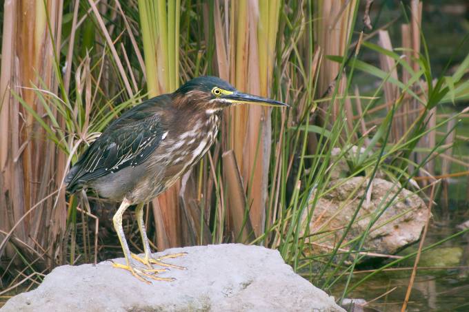 | Green Herons stand still at the water's edge and wait to ambush prey. They mainly eat small fish, frogs and aquatic insects. They sometimes drop food on the water's surface to attract fish. Their call is a loud and sudden kyow. | image041.JPG |